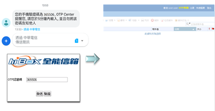 使用郵件簡訊OTP密碼鎖服務,意即hiBox客戶在登入webmail信箱時,除了輸入信箱帳號密碼外,須同時輸入由OTP中心(OTP Center)發送至您手機的簡訊密碼,